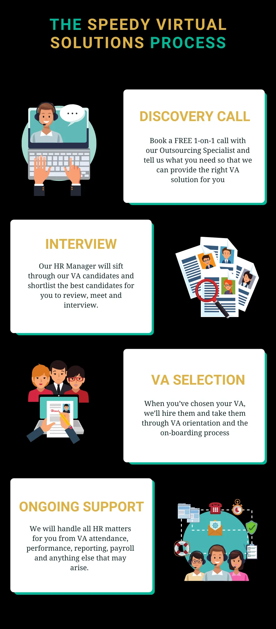 You don’t have to worry about the payroll, because we handle all financial assistance needed for your VAs.